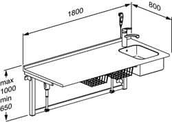 Puslebord, 800 x 1800 mm, elektrisk højderegulérbart, med sanitet og standardarmatur