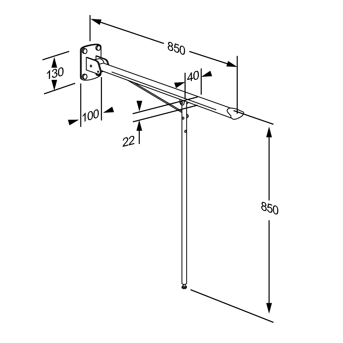 Ausladung: 850 mm. Der Stützklappgriff ist hochklappbar.