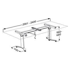 Manuelle Hubeinheit für freistehende Arbeitsplatte, Länge 2001 - 2400 mm. 300 mm höhenverstellbar. Inkl. 2 Teleskopbeinen, Träger, Längs- und Querprofile und Handkurbel.. Pressalit empfiehlt beidseitig 400 mm Platten überstand, um dieAnfahrt im Rollstuhl zu erleichtern.. Gewünschte Länge bei Auftragserteilung angeben.