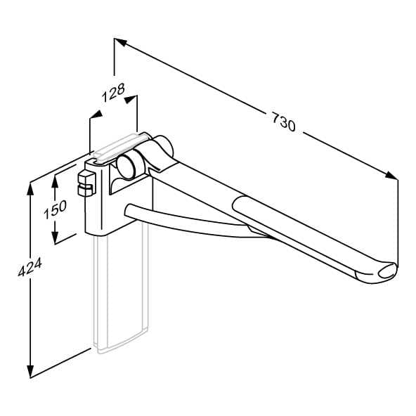 • PLUS Stützklappgriff mit Federbelastung. Gesamtlänge 730 mm. Die Armlehne hat eine ovale form, und der Abschluss des Griffes stützt und bietet komfortablen Halt. Linksbedient. Höhenverstellbar auf senkrechter Wandschiene. Hochklappbar.