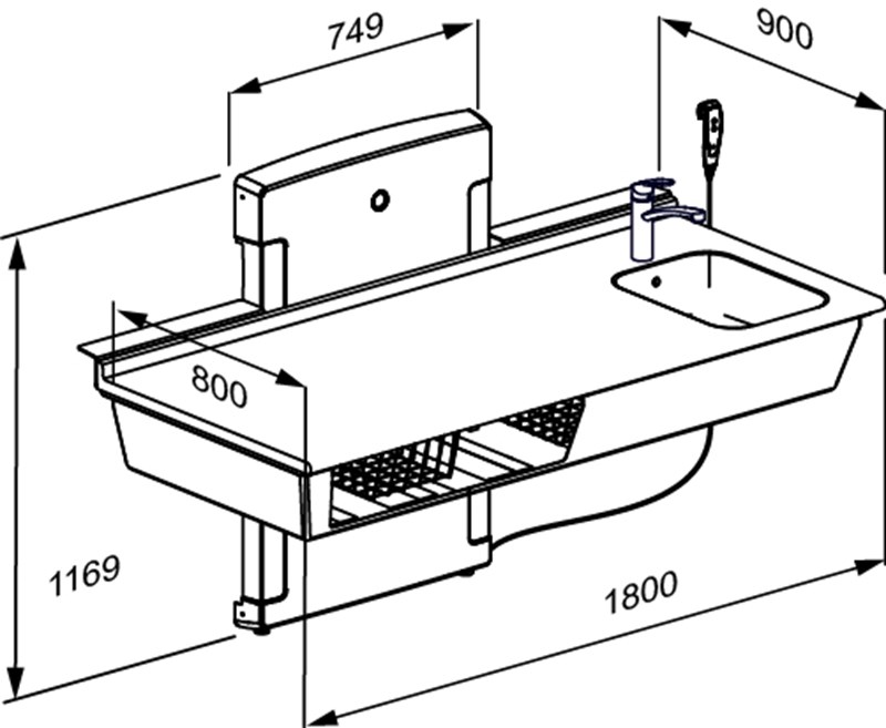 • Low start, wallhung changing table, with sanitary appliances, 800 x 1800 mm.