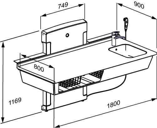 Changing table, 800 x 1800 mm, electrically height adjustable, with sanitary appliances and standard mixer tap