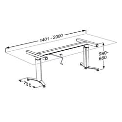 Manual lift for freestanding worktop. For worktops from 1400 - 2000 mm. Height adjustable 300 mm. Including 2 telescopic legs, longitudinal and cross braces and crank handle. Pressalit recommends overhang of 200 mm at either end of worktop to allow for ease of approach in wheel-chair. Please state desired length when ordering.
