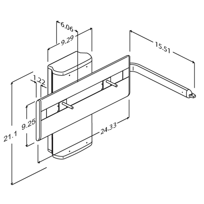 The arm that holds the lever control can function as a towel bar. The lever control can be placed on the right- or left-hand side of the sink. This sink bracket is supplied as standard with a pneumatic cylinder for sinks weighing 35.3-48.5 lbs, however, it is possible to order it for sinks weighing 17.6-26.5 lbs or 26.5-35.3 lbs.