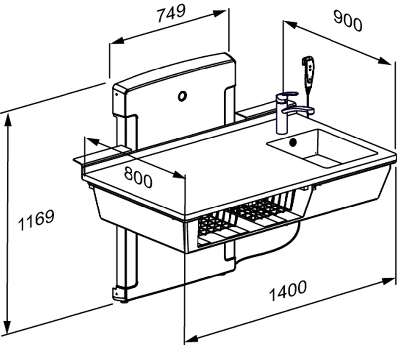 Changing table, 800 x 1400 mm, electrically height adjustable, with sanitary appliances and standard mixer tap