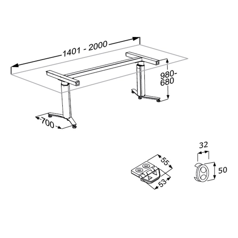 Electric lift for freestanding worktop. For worktops from 1400 - 2000 mm. Height adjustable 300 mm. Including 2 telescopic legs, longitudinal and cross braces and switch. Pressalit recommends overhang of 200 mm at either end to allow ease of approach in wheel-chair. Please state desired length when ordering.