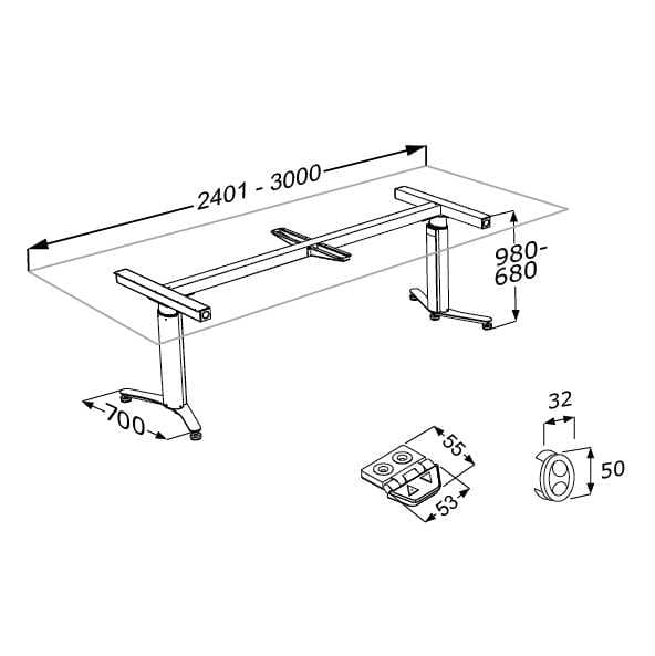Electric lift for freestanding worktop. For worktops from 2401 - 3000 mm. Height adjustable 300 mm. Including 2 telescopic legs, brackets, longitudinal and cross bracesand switch. Pressalit recommends overhang of 400 mm at either end of worktop to allow for ease of approach in wheel-chair. Pease state desired length when ordering.
