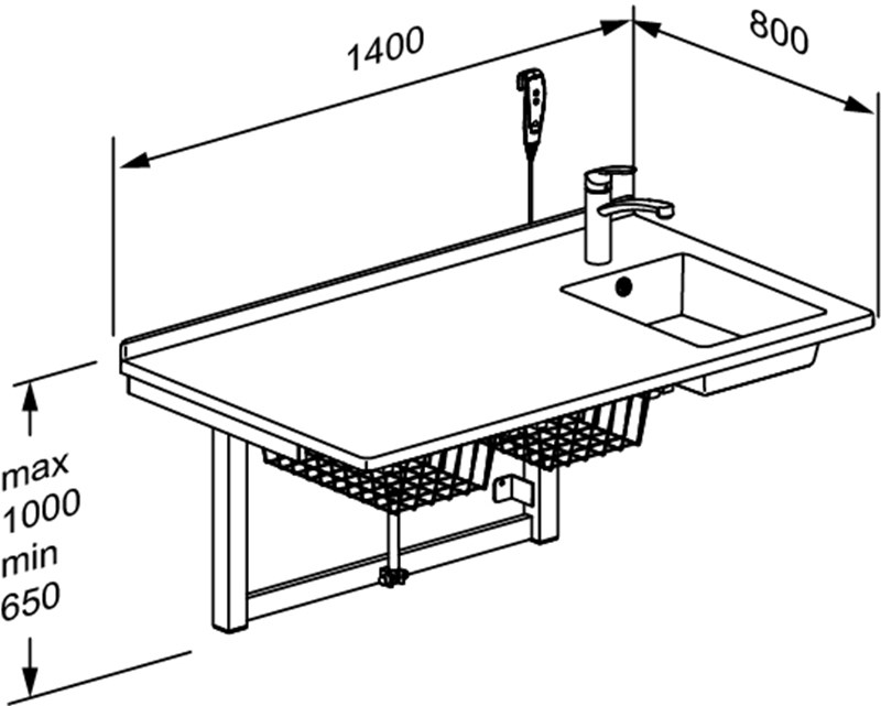 Table à langer, 800 x 1400 mm, réglable en hauteur électriquement, avec lavabo