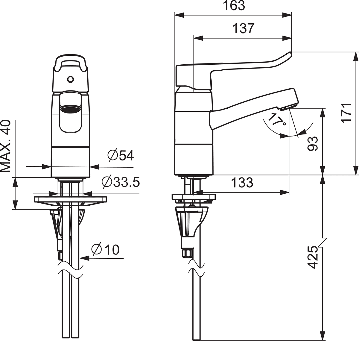 Den lange svingtud gør det nemmere for siddende brugere at nå vandet. Tuden svinges til siden, hvis den er i vejen.
