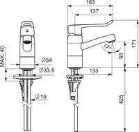 • Blandingsbatteri med lang svingtud og bøjlegreb. 175 mm flex slange. Varmt og koldt symboler. Med skoldningssikring og vandsparefunktion. Ekskl. bundventil.