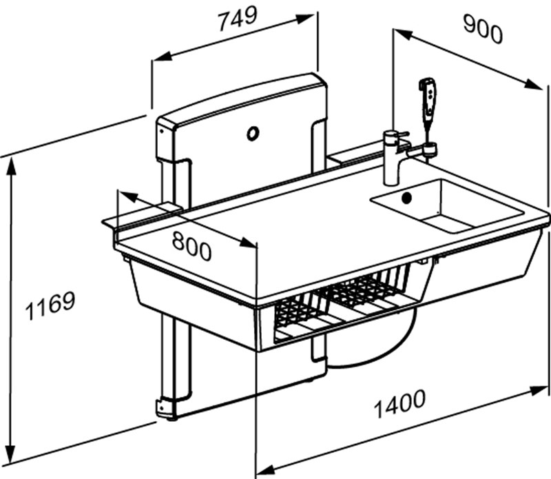 Aankleedtafel, 800 x 1400 mm, elektrisch in hoogte verstelbaar, met wasvoorzieningen, incl. mengkraan met uittrekbare handdouche