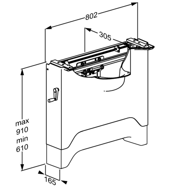 Handmatig in hoogte verstelbaar met zwengel 300 mm, en handmatig zijwaarts verstelbaar 500 mm.
