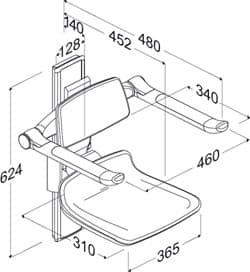In hoogte 250 mm verstelbaar. Zitting en armleuningen zijn opklapbaar.